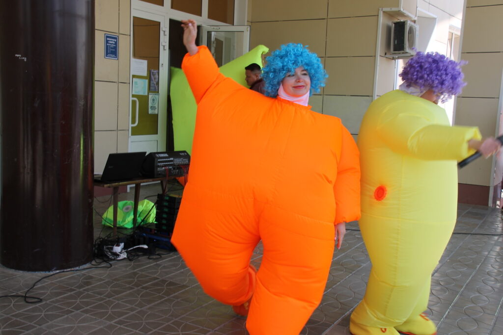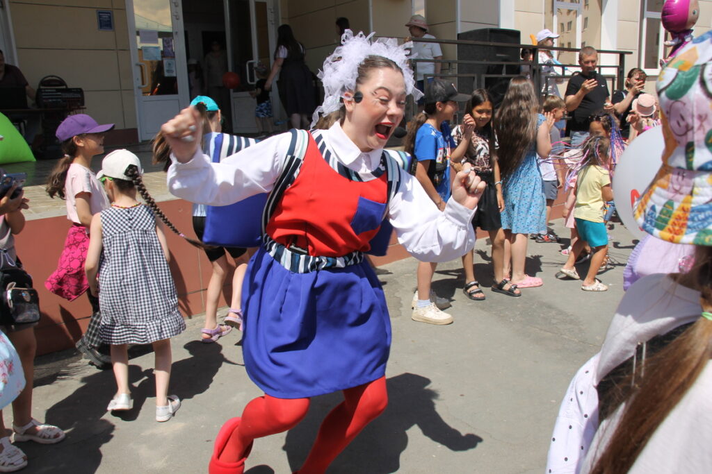 Праздник начался с красочной процессии, в которой участвовали персонажи из любимых детских мультфильмов и сказок. Фуфындра, Школьница, героиня «мыльной оперы» Мочалка и два жителя Страны Надувных Летающих Подушек – Надуварики.