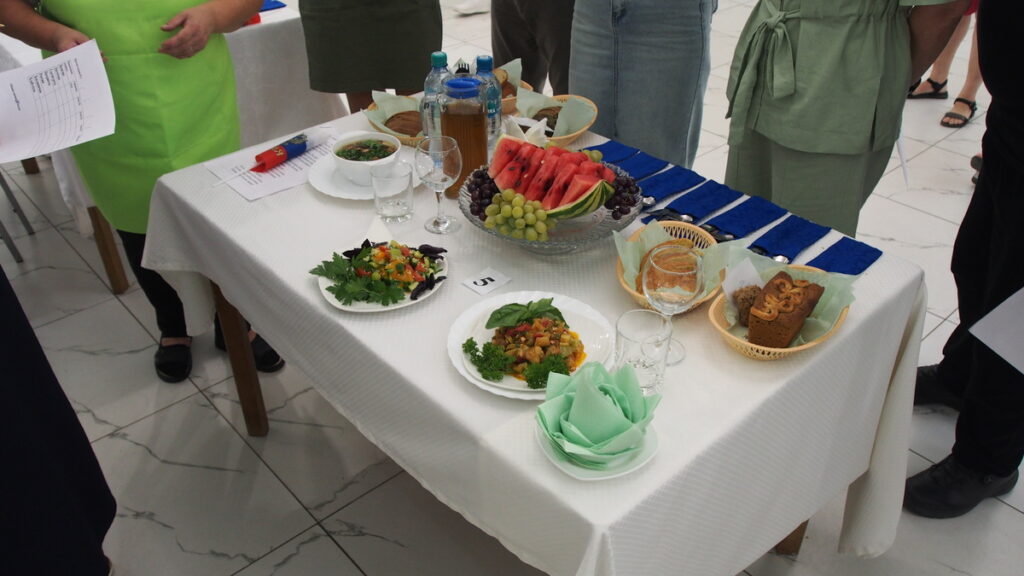 Для всех участников приготовили «черные» ящики с определенным набором продуктов, из которых в течение 45 минут нужно было приготовить три блюда и «компот». В основу меню вошли мясо курицы и овощи.