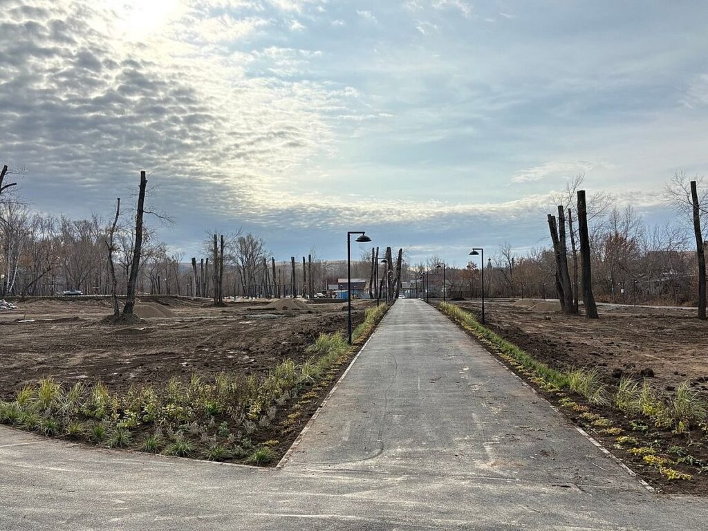 Уже обустроена набережная вдоль реки Кураганка, выполнены сцены, заасфальтирована спортивная площадка, большая часть пешеходных и велосипедных дорожек. Устанавливаются различные малые архитектурные формы. Устраиваются терренкуровые тропинки. Завершаются работы на парковочной зоне, рядом укладывается брусчатка.